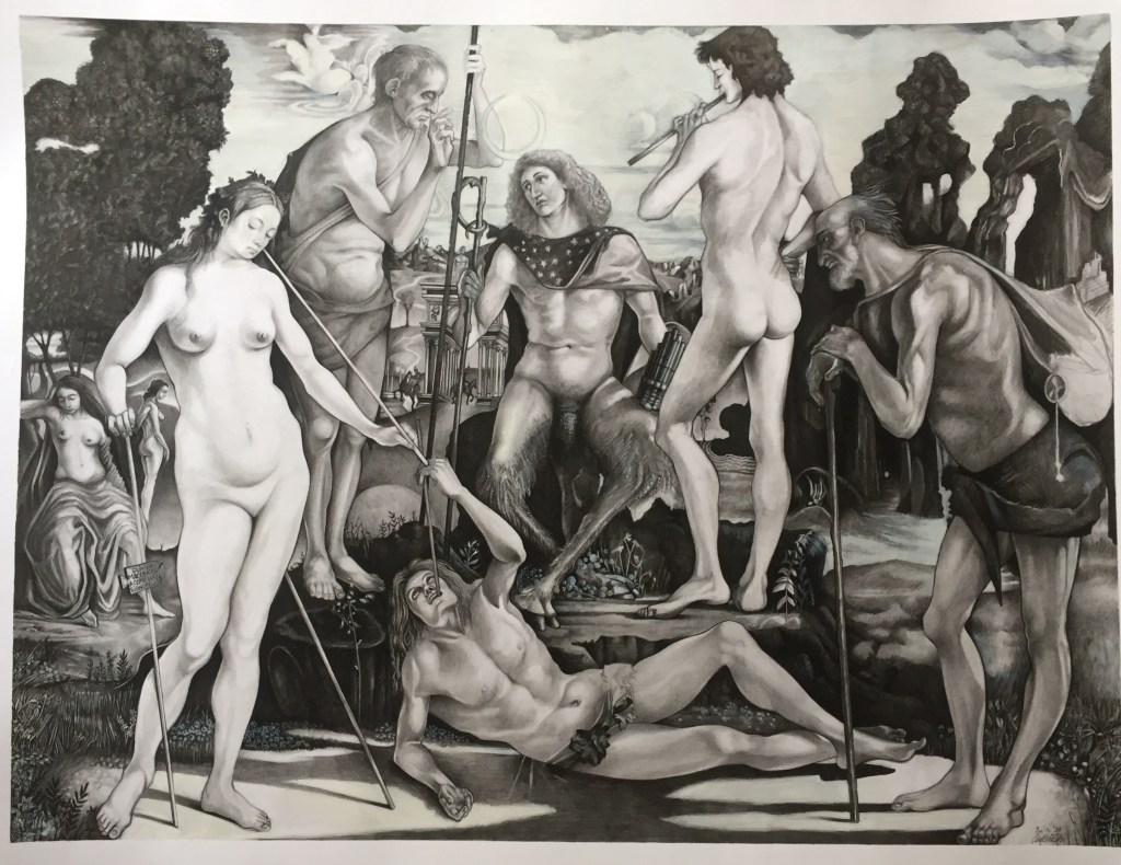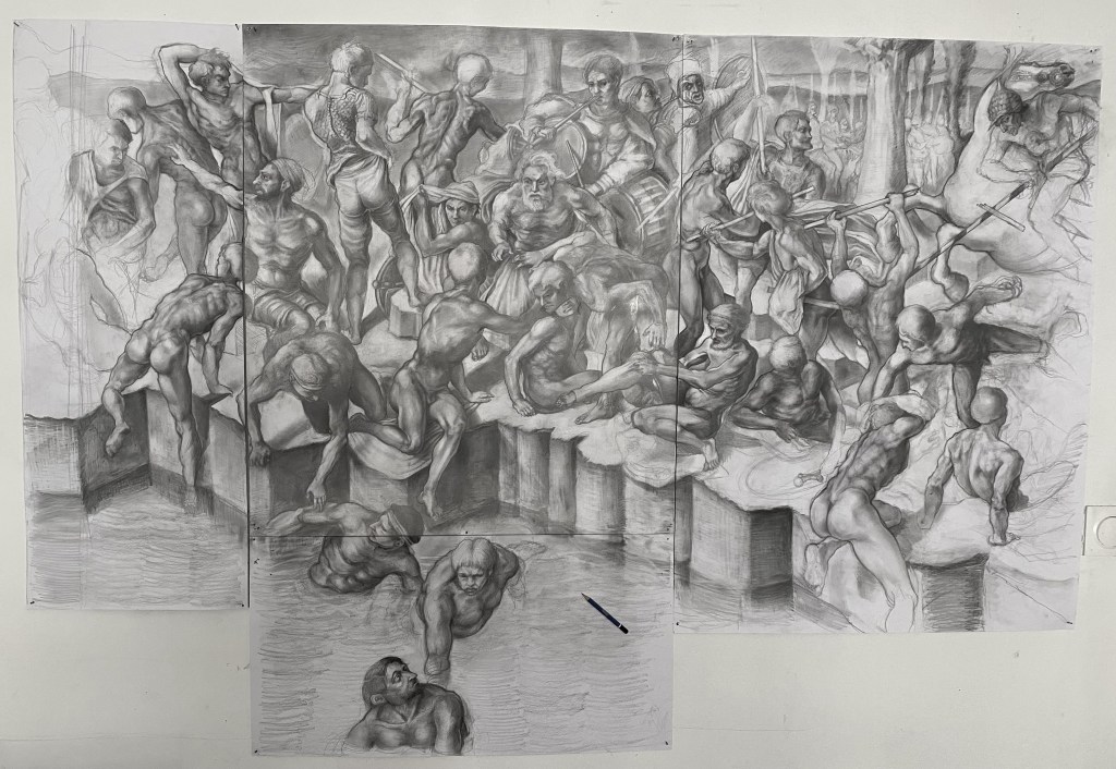 Reconstitution graphique du carton perdu de la fresque de la Bataille de Cascina de Michelangelo Buonarroti pour le Palazzo Vecchio de Florence. Crayon sur papier Bristol.188x138cm. Paris, 2024. Composition réalisée à l’aide des croquis de Michelange et de la peinture de Bastiano da Sangallo