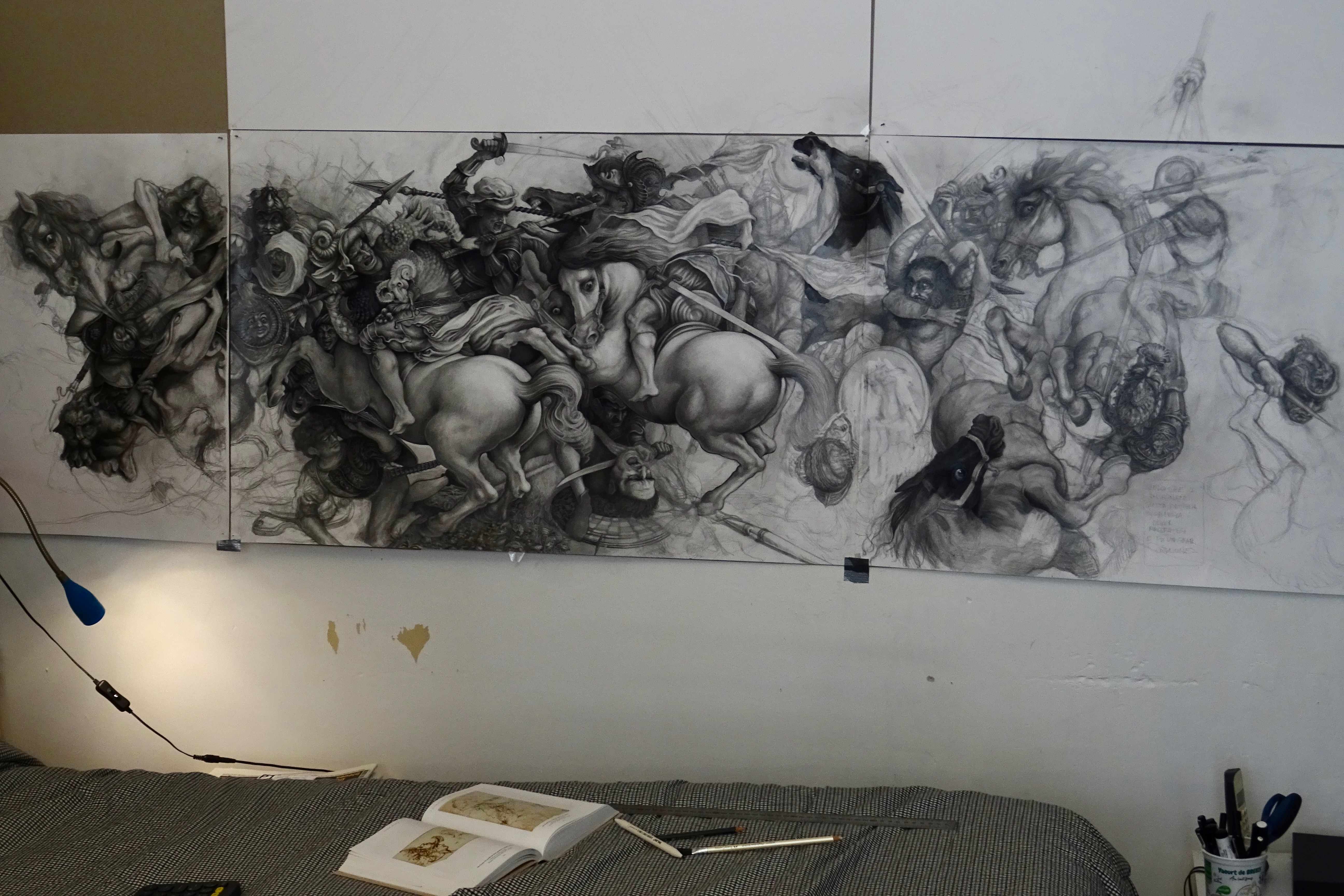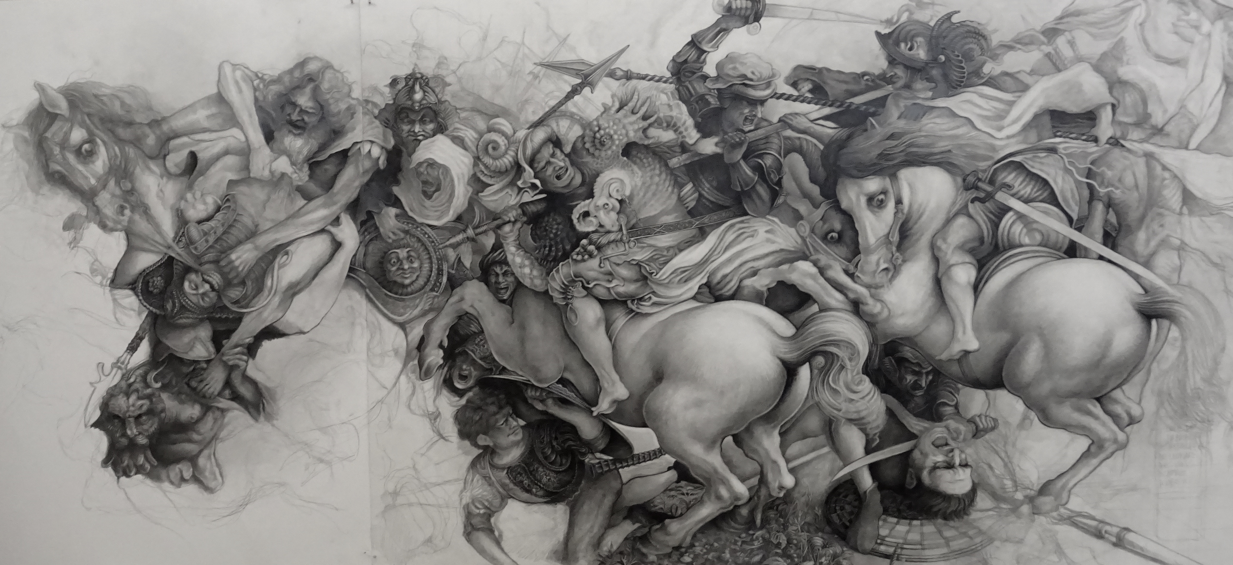 Reconstitution graphique en partie imaginaire de la fresque perdue de la Bataille d’Anghiari de Léonard de Vinci pour le Palazzo Vecchio de Florence. Crayon et Feutre sur papier Bristol. 230x130cm. Paris, 2023. Composition réalisée à l’aide des croquis du Vinci et des oeuvres de Rubens, Rustici, Ruccelai, Commodi et Bergeret.