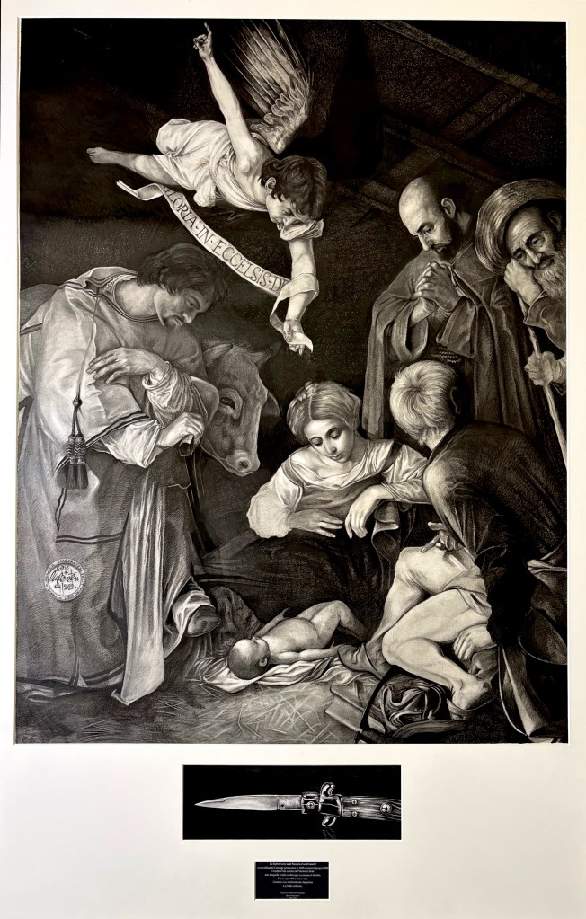 Copie au crayon et feutre noir d’une photographie couleur de la Nativité avec saint François et saint Dominique du Caravage, toile découpée au couteau et dérobée en 1969 à Palerme, 133x89cm, Paris, 2022