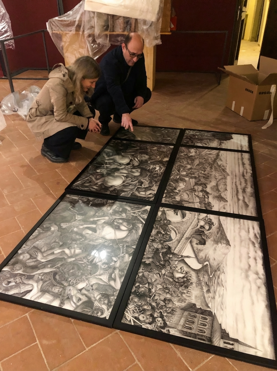 Reconstitutions graphiques d’une fresque perdue du Palais Petrucci à Sienne (Ce travail a été réalisé d’après un dessin de Luca Signorelli. au crayon, feutres noir et blanc. l’arrière-plan est imaginaire.) et d’une toile brûlée dans l’incendie de la Tour Flak de Berlin en 1945. (copie d’après photographie)