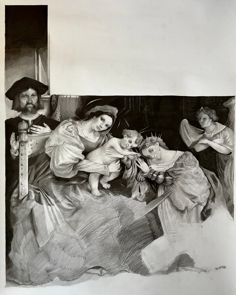 Reconstitution inachevée du mariage de sainte Catherine de Lorenzo Lotto. Le tableau de Bergame a été mutilé de son paysage (rectangle blanc supérieur) par un soldat de François 1er. crayon et feutre noir sur papier, 70x80cm, Paris, 2024