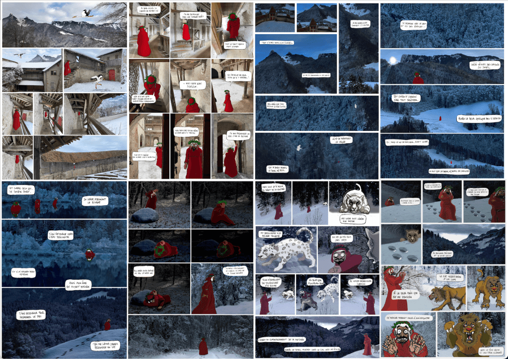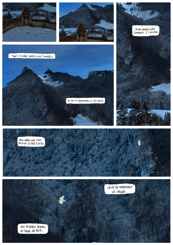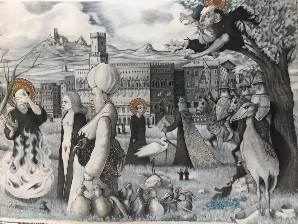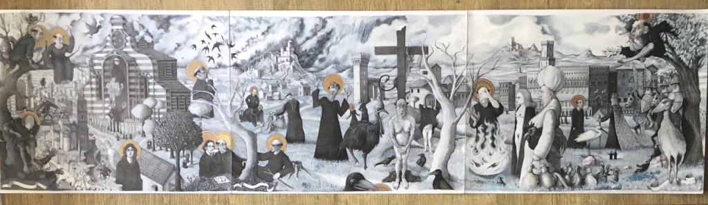 « Ce dessin d’illustration (ci-dessus) tend à organiser les récits fabuleux des petites fleurs de Saint François d’Assise dans un espace-temps propre aux Thébaïdes de Fra Angelico. Le dessin fait en outre référence au déjeuner sur l’herbe de Manet et aux oiseaux d’Hitchcock / This illustration drawing (above) tends to organize the fabulous stories of the small flowers of Saint Francis of Assisi in a space-time in the manner of Thebaids by Fra Angelico, by enriching it with a reflection by referring to the lunch on the grass of Manet and the birds of Hitchcock. »