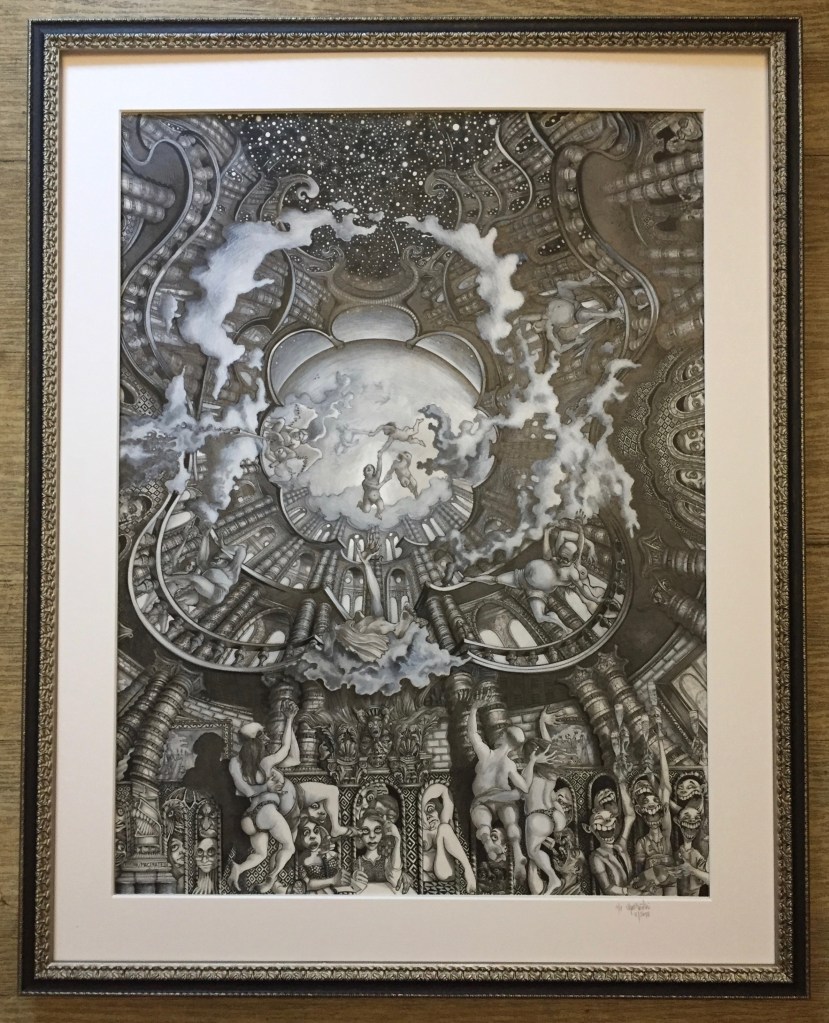 Tout petit, la télévision de la salle-à-manger n’émettait qu’en noir-et-blanc. Félix-le-chat était noir, la surface lunaire blanche sur fond de ciel noir était traversée par des cosmonautes en blanc. Et quand Nounours devint Marron pour quelques privilégiés, c’était encore de gris qu’était pour moi fait ce marron. Pareillement, les premiers jeux vidéos que l’on branchait au téléviseur cathodique, le premier ordinateur ZX81, et les touches du premier piano familial, dans le salon… Alors naturellement, comme je préfère aussi le vin blanc minéral, je dessine en noir-et-blanc. Quand l’Homme aura fait un petit pas sur Mars, peut-être ferai-je un grand pas dans la technique du dessin aux trois crayons…