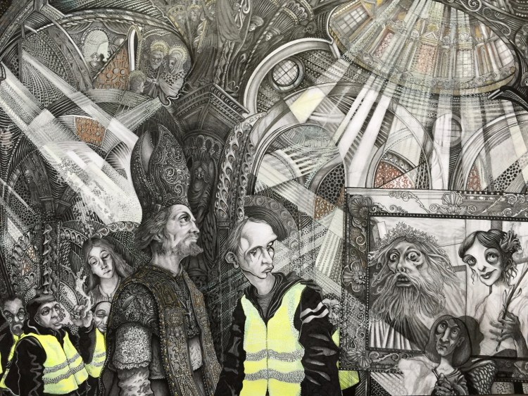 Détail de Cappriccio avec êveque et Gilet Jaune, Feutres et crayon sur papier, 39x39cm, Paris, 01/2019