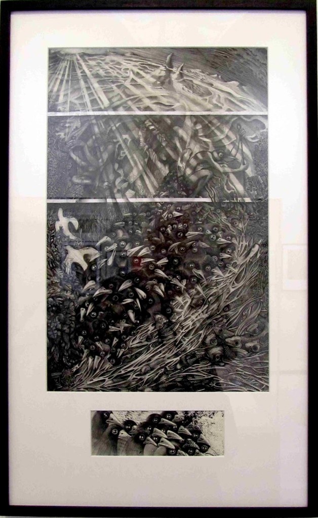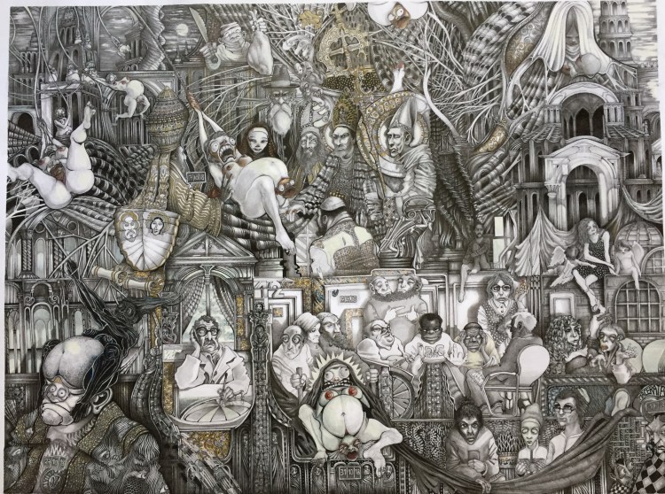 Dieu ne joue pas au dé…tout seul, crayon et feutre sur papier, 70 x 40cm, Paris, 06/2015 (dessin ayant reçu le premier prix du salon des artistes de la Ville de Paris en 2015)