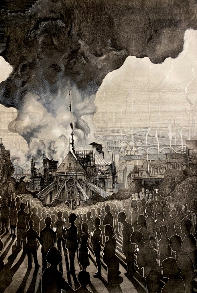 L’incendie de la Cathédrale Notre Dame de Paris, Feutres et crayon sur papier, 110x 75cm, Paris, 2019