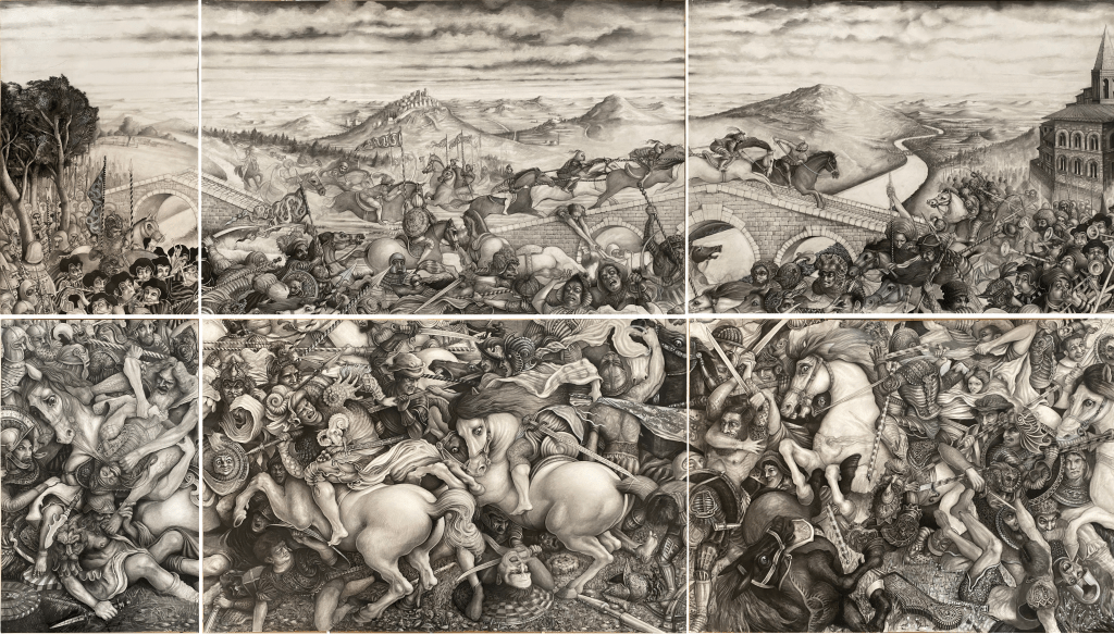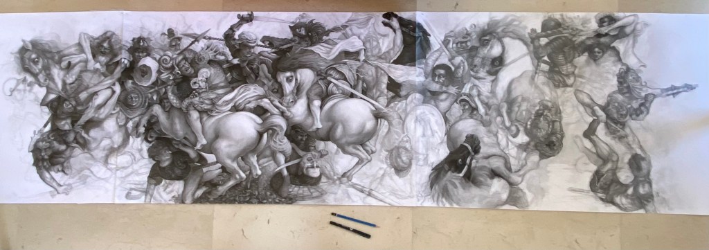 Cette reconstitution en partie interprétative et imaginaire de la Bataille d’Anghiari a été effectuée à partir des dessins de Rubens, de Bergeret, des sculptures de Gianfrancesco Rustici et des croquis de Léonard de Vinci. La Fresque, réalisée dans la salle des cinq cents du Palazzo Vecchio de Florence a été effacée après qu’elle ait été endommagée par les mauvais choix d’une technique supposément héritée des romains de l’Antiquité.